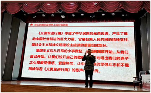 在讲座中,于海指导同学们理解和感悟中华人民共和国国歌《义勇军进行曲》激昂向上、铿锵有力的艺术特色,结合党领导民族独立解放的时代背景,为同学们讲述了国歌中的爱国主义内涵,坚定同学们坚定跟党走的理想信念。在讲座中,于海分享了香港回归和利比亚撤侨中的国歌故事,帮助同学们充分理解国歌作为国家主权的声音象征和精神符号的重要意义。